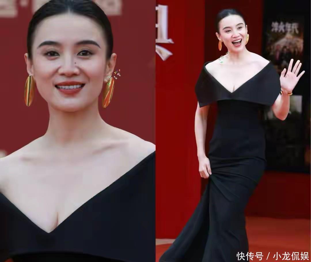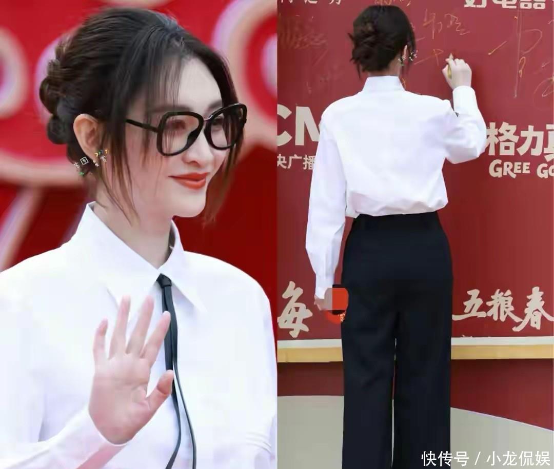 李小冉同样选择了裤装,白衬衫黑西裤,身材高挑笔直,尽管颈纹暴露了年龄,但那份自然生动,同样动人。