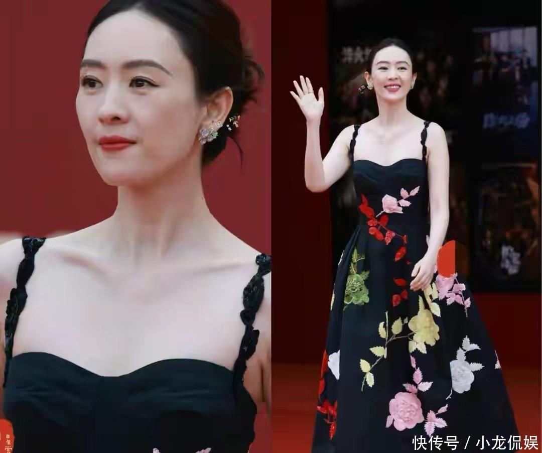 童瑶一改往日犀利,用一袭黑色花朵吊带裙展现了温柔韵味。